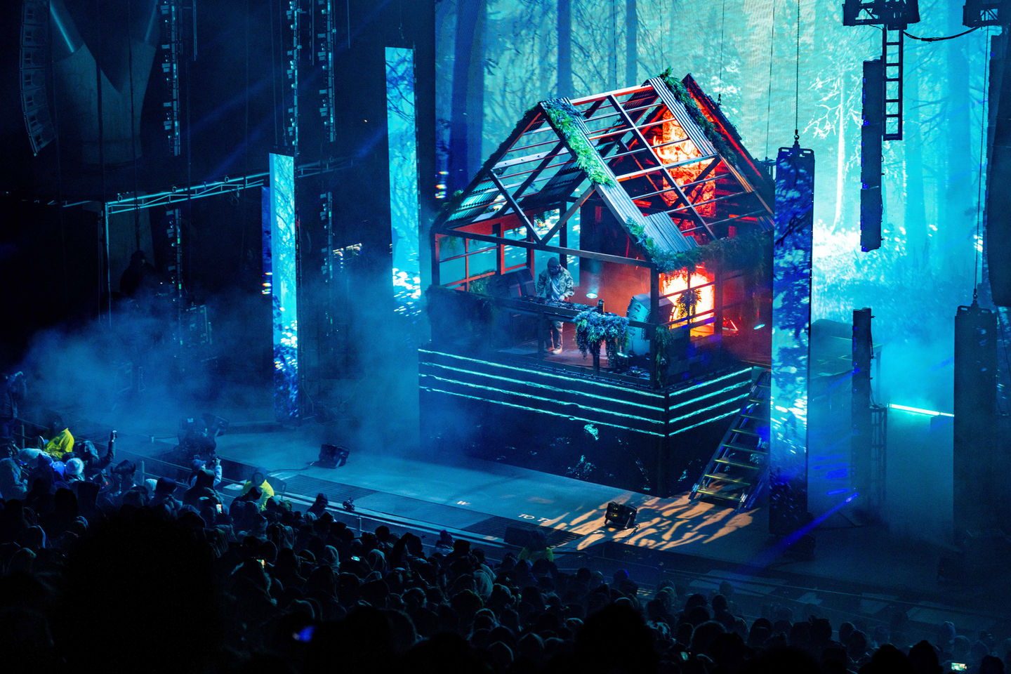 Kicking off their Winter Tour at Red Rocks, Of The Trees closed out the venue’s season with two sold-out nights and debuted their new production. Measuring 16 feet in width and 12 feet in depth, the cabin rose to about 16 feet in height, dominating the stage. It encapsulated the artist with its blow-through framework and foliage decor, creating a true "home away from home".